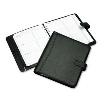 Includes a sturdy binder with undated calendar pages, tabbed address/phone directory, tabbed monthly dividers, 24-sheet lined notepad, business/credit card holder, vinyl zip pouch, handy reference pages and a page locator. Crushed-grain simulated leather. Cover Color(s): Black; Sheet Size: 8 1/2 x 11; Closure: Snap; Binding Type: 7-Ring.