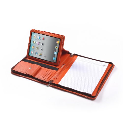 This Orange iPad Zippered Leather Padfolio, with iPad House Detachable and multi-angle viewing, writing Pad holder fit Both 8.5 x 11 inch Spiral Notebook & Regular Notepad, is a must have item for any business professional. This Padfolio makes a great gift for anyone that uses their iPad for business purposes. The Padfolio allows for safe transport of an iPad while traveling. The iPad Padfolio is a must have item for businessmen iPad owner.